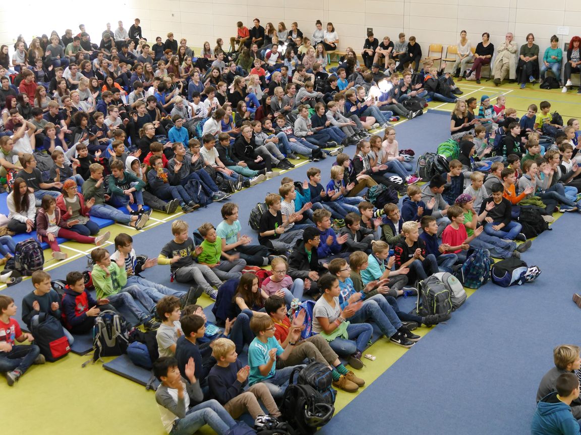 "Willkommen 700 Dreikönigskinder!" - so begrüßte der Schulleiter Herr Jonas beeindruckt die gesamte Schulgemeinschaft. Zu diesem Zeitpunkt hatte Frau Naumann aber bereits ihr formidables Talent zur Moderation von Großveranstaltungen unter Beweis gestellt und mit allen Anwesenden ein rhythmisch eingeleitetes "Und bitte ..." für die nun folgenden Künstler einstudiert.