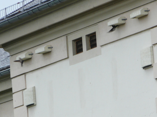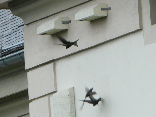 Mindestens die Hälfte wird von den Mauerseglern besetzt. Aus einem Fenster des A-Hauses gelangen uns im Juni 2009 einige eindrucksvolle Fotos, die zeigen, wie die Segler die Kästen am C-Haus von unten anfliegen, sich festklammern und in den engen Spalt kriechen.