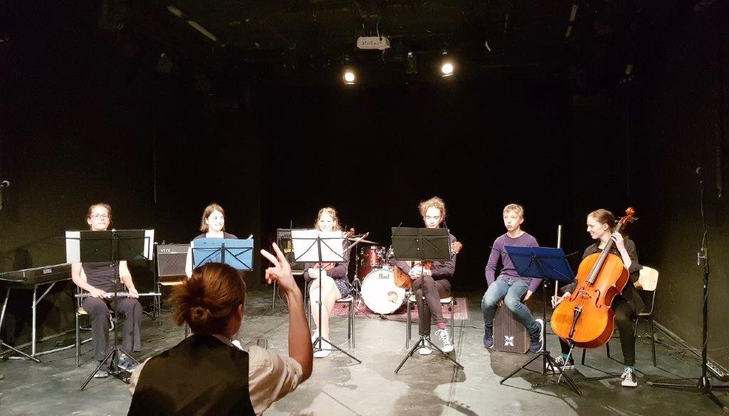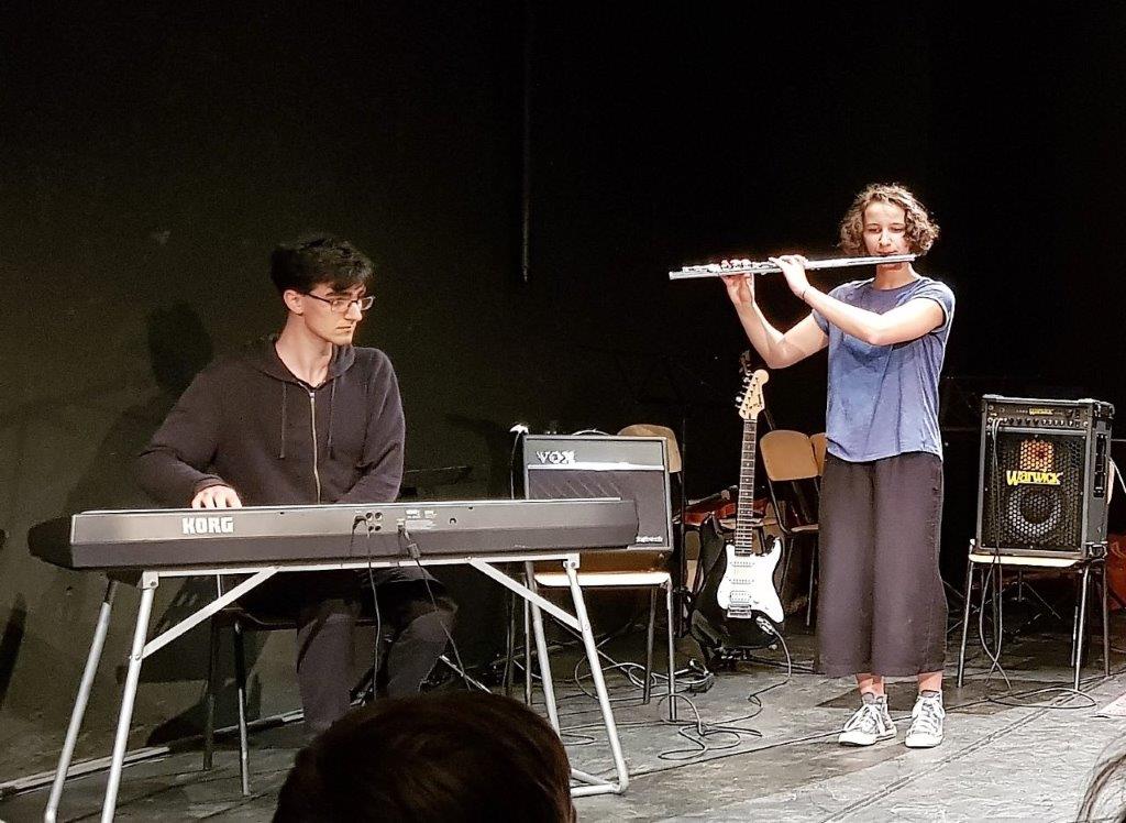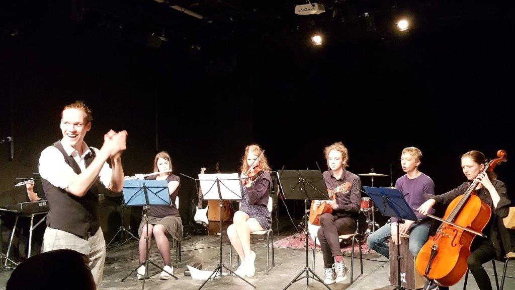 Querflöten, Gitarre, Violine, Cello, Cajon und dazu zwei engagierte Musiküsse – Gabriele Scharfenberger und Maximilian Schwarze, die als gemeinsame Ensembleleitung die jungen Instrumentalistinnen und Instrumentalisten in dieser besonderen Besetzung zum Klingen bringen, auf eine Weise, dass es einfach große Freude bereitet, ihnen zuzuhören.