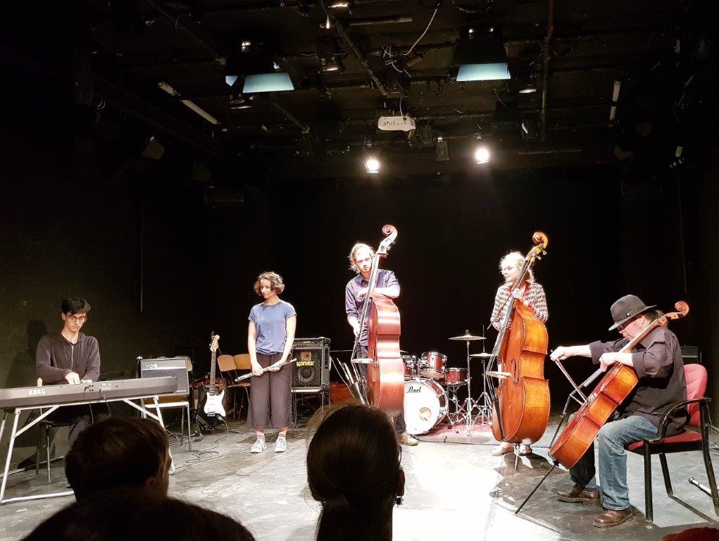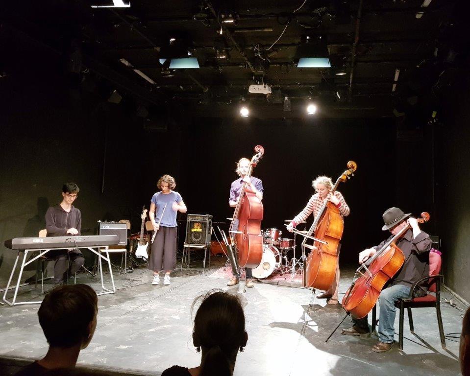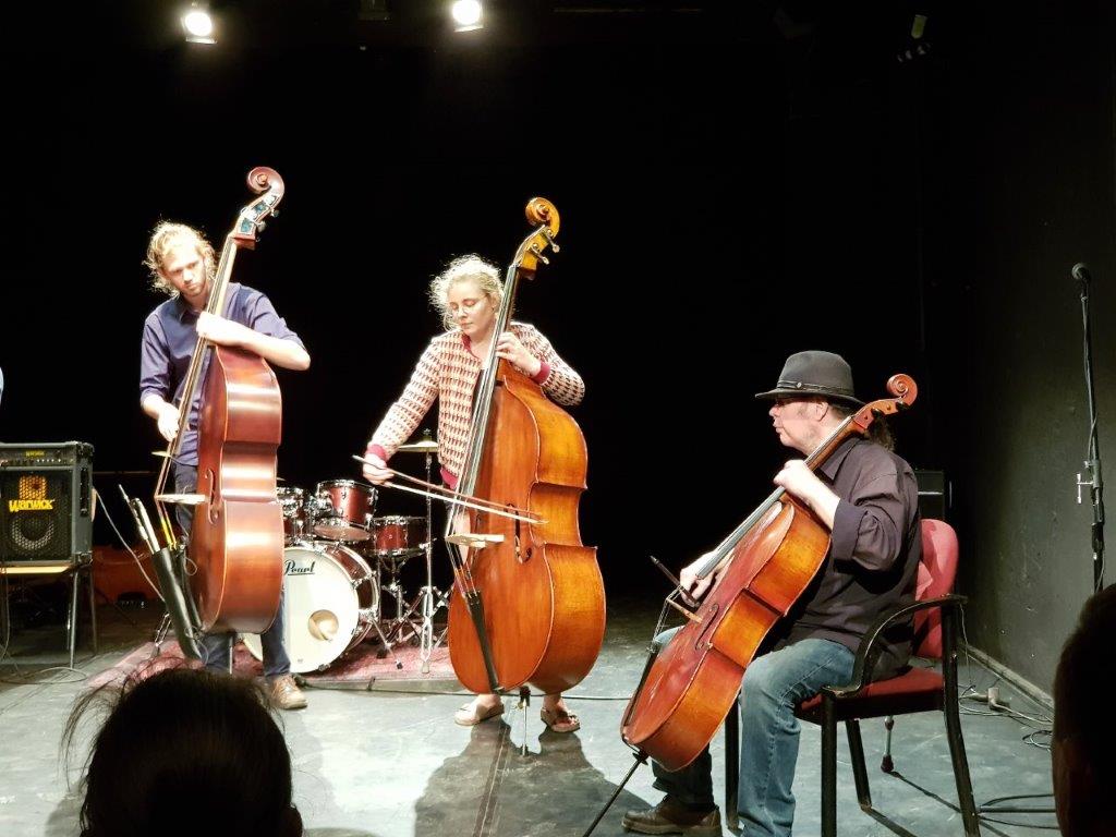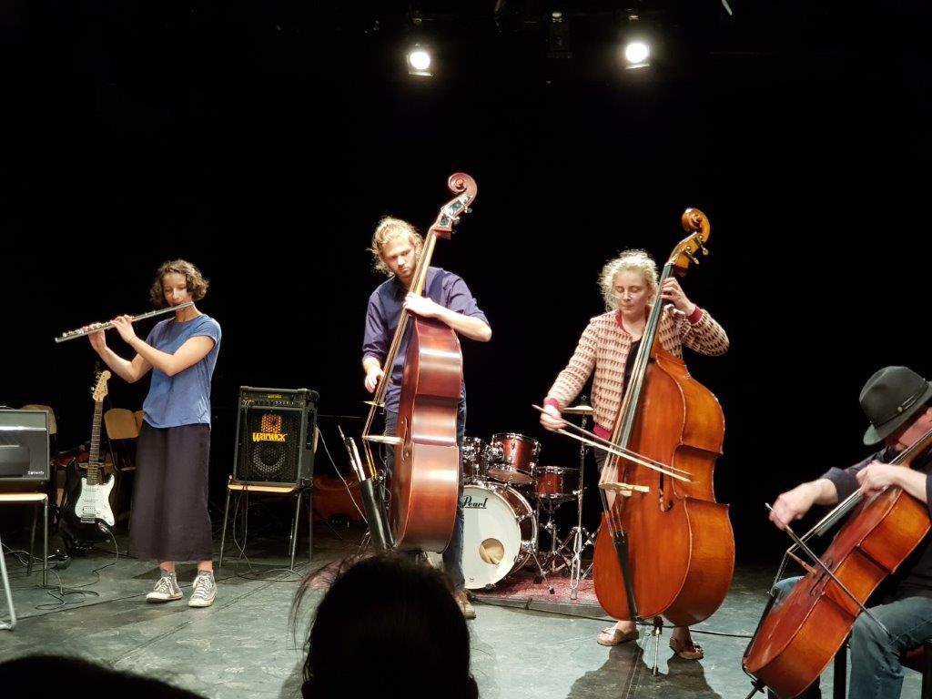 Und dann die „Großen“. Musikalische Improvisationen, angestiftet seit „Ewigkeiten“ vom Kultkünstler der Dresdner Neustadt, Peter Koch, wunderbar elektrisierend und musikalisch miteinander musizierend agierend, zwei Kontrabässe, ein Klavier, eine Querflöte, ein Cello. Winzige Zeichen der Verständigung sind Signal für Klangwolken, von denen sich Musiker und Musikerinnen gleichermaßen tragen lassen wie ihr begeistert lauschendes Publikum. Einfach nur schön! Phantasievoll! Genial! Musikantisch gekonnt! Und dann wieder Umbau.