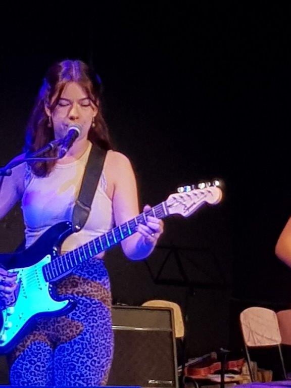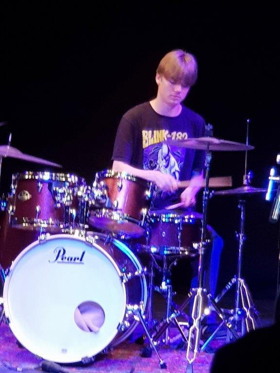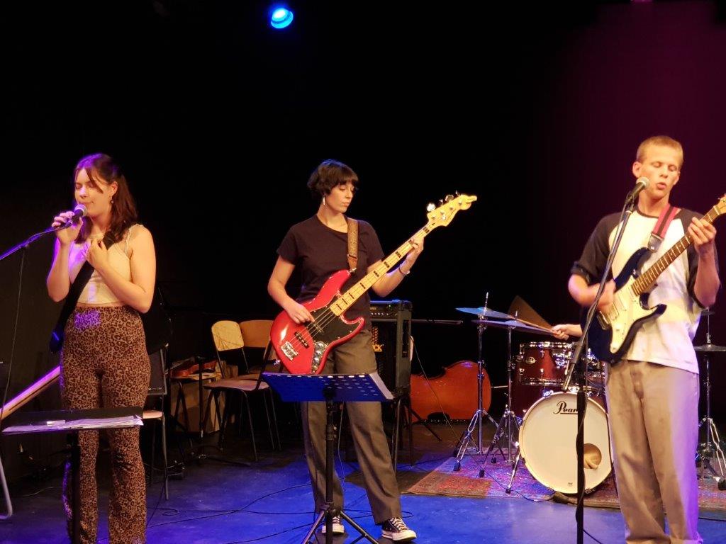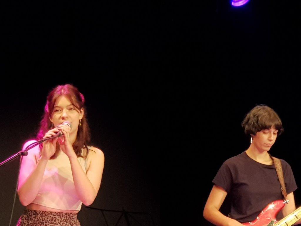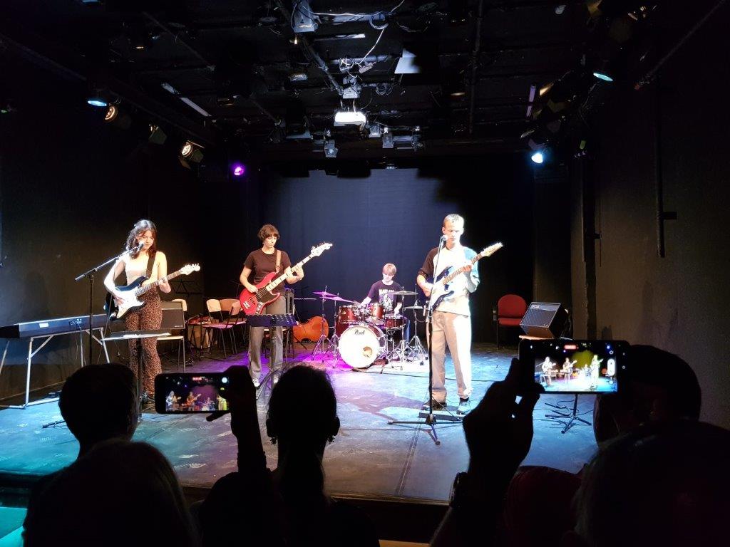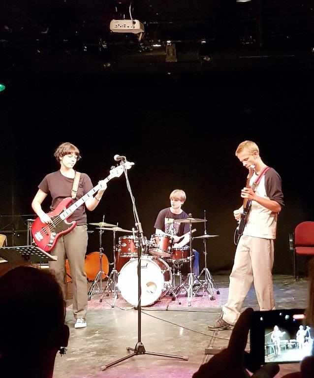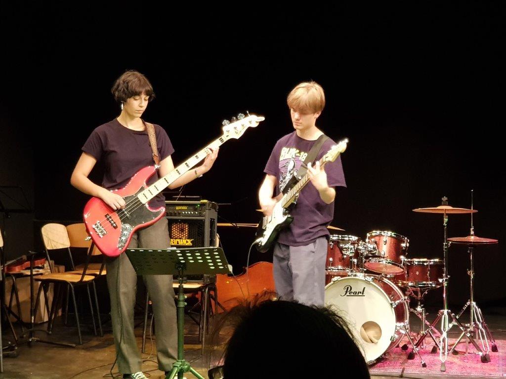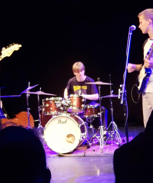 Und dann spielen sie auf: die betörende und vielschichtige Sängerin, die souveräne Bassistin, der Akrobat auf der Gitarre und im Satzgesang und der leidenschaftliche Schlagzeuger, der gern noch viel lauter gespielt hätte, auf dem neuen, vom Förderverein des Gymnasiums finanzierten, Schlagzeug.