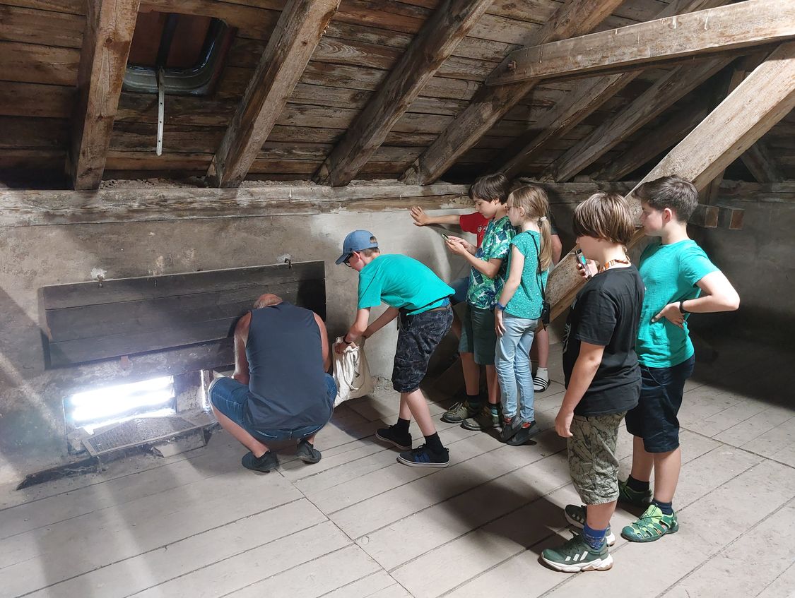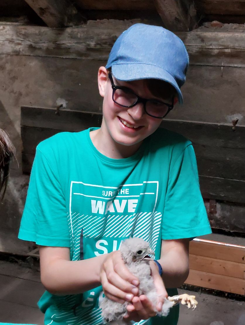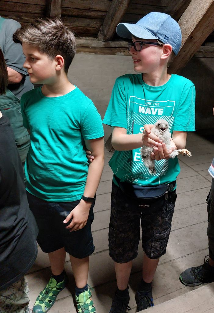 Der Beringer Michael Hupfer erklärte den anwesenden 12 Kindern der Bio-AG (GTA) „Erlebte Natur“ zunächst, welche Ringe es für welche Vögel gibt. Dann gingen wir durch den staubigen Dachboden zum Nistkasten. Herr Hupfer nahm die „Plüschtiere“ aus dem Kasten und legte sie in einen Stoffbeutel. Danach bekam jedes einen Ring der Vogelwarte Hiddensee und wir konnten sie hautnah bestaunen. Es ist unglaublich, wie laut diese kleinen Federbälle schon rufen können. Von den fünf geschlüpften Küken konnten vier Jungfalken beringt werden. Das Nesthäkchen hat leider nicht überlebt. Wahrscheinlich gibt es dieses Jahr zu wenig Nahrung, vor allem nicht genug Mäuse, um alle Schnäbel zu stopfen.