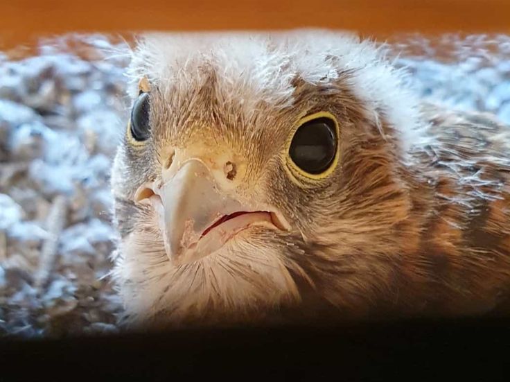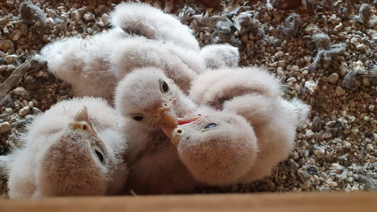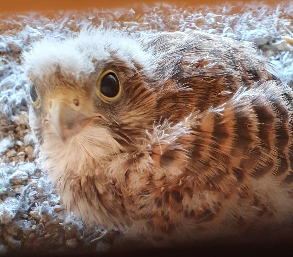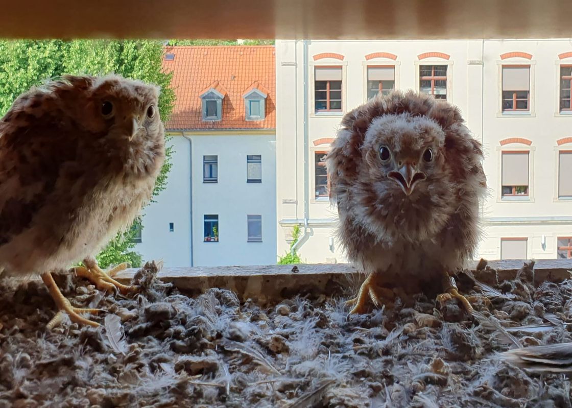 Am 15. Juni konnte Herr Knoll aus der 3. Etage des A-Hauses mit dem Fernglas sehen, wie das Turmfalken-Weibchen ein kleines Küken verfütterte. In den ersten Tagen wird die Beute zerzupft und den Kleinen das Beste vom Stück, nämlich das Muskelfleisch, „schnabelgerecht“ gereicht.