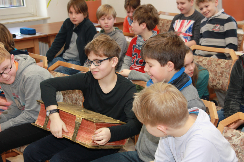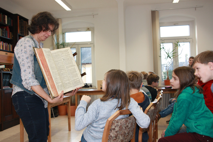 Heute waren wir in der Bibelgesellschaft in Dresden-Blasewitz. Eine nette Frau hat uns viel über Bücher und die Bibel erklärt. Dabei durften wir verschiedene Materialien selbst in die Hand nehmen, wie z. B. echtes Papyrus oder Pergament. Auch wurde eine sehr alte Bibel herumgereicht, um ihr Gewicht zu schätzen.