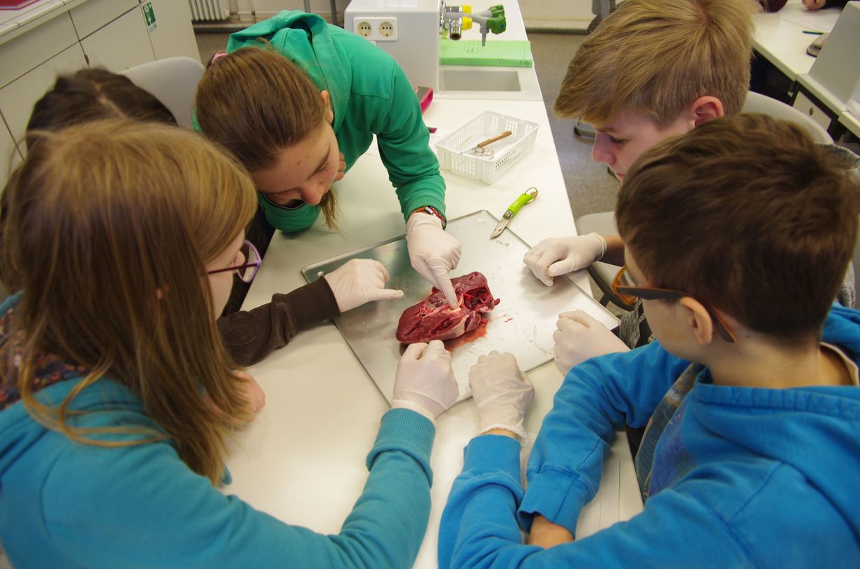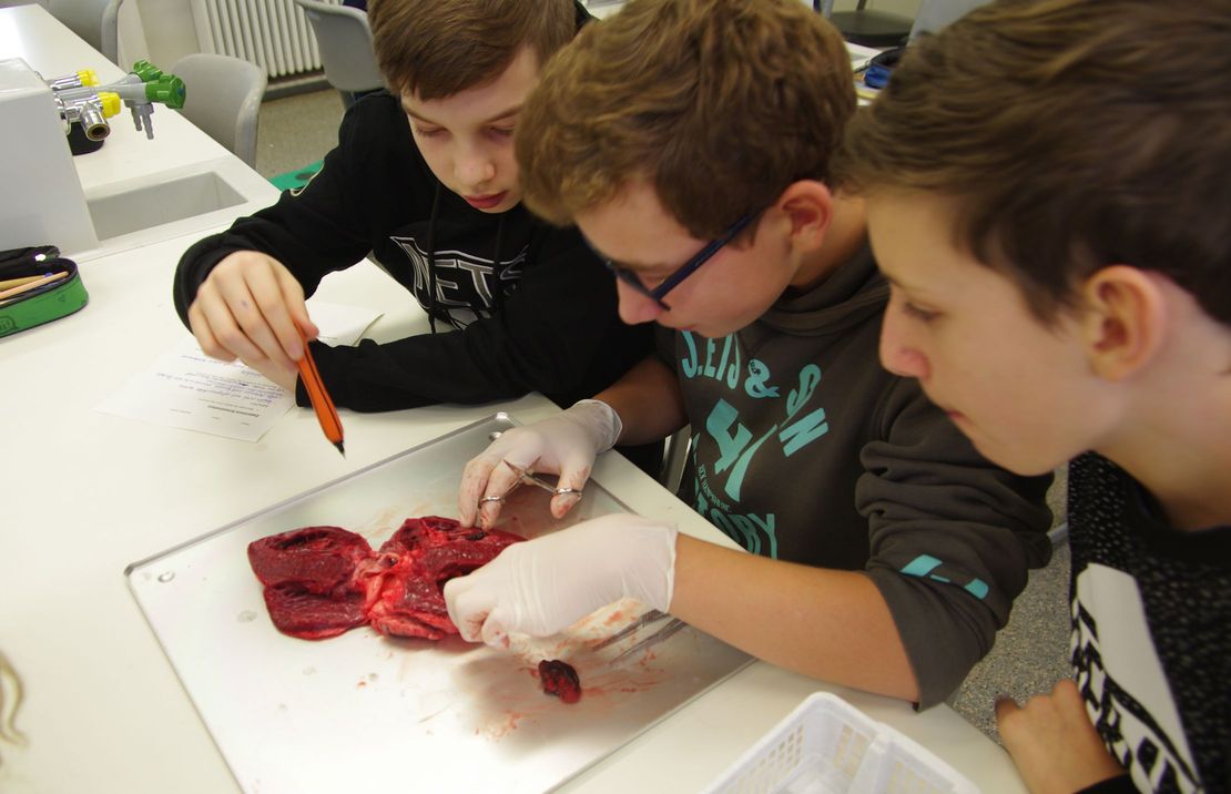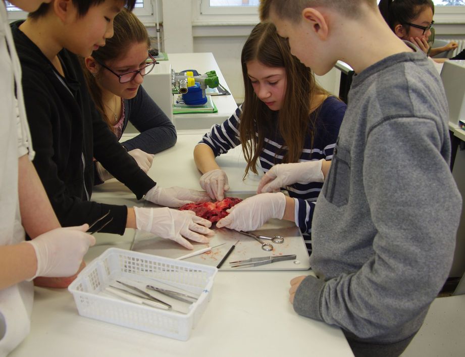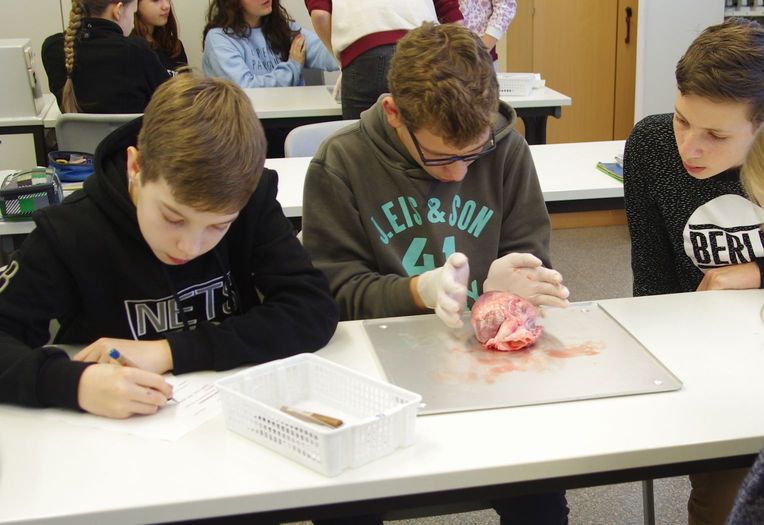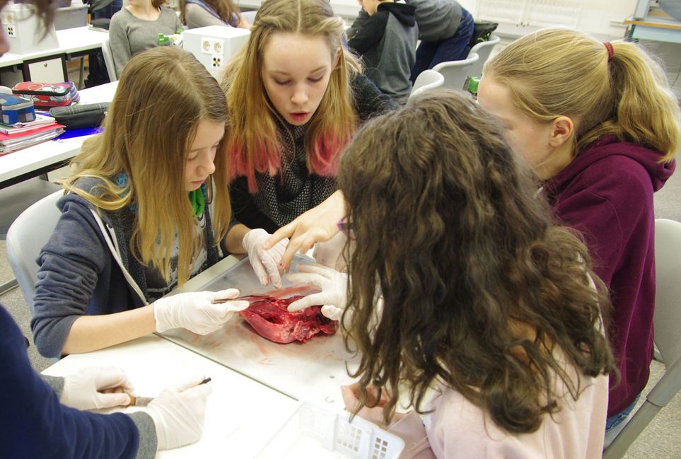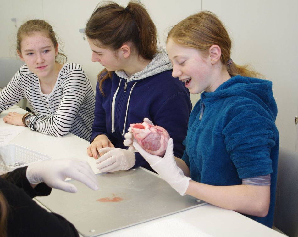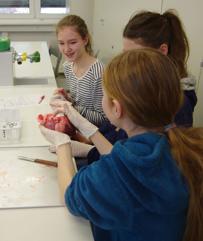 Vorsichtig betasten wir mit Handschuhen das Herz. Anfangs sind alle noch etwas zaghaft, doch schon bald untersuchen wir die Schweineherzen mit großem Interesse.