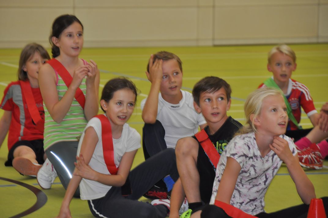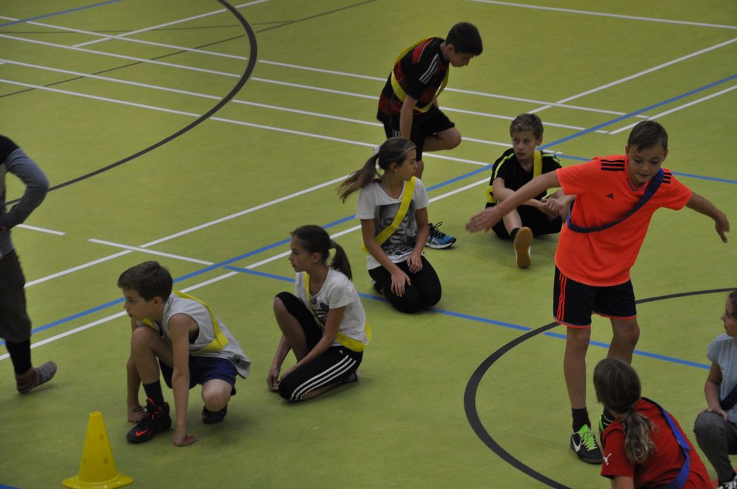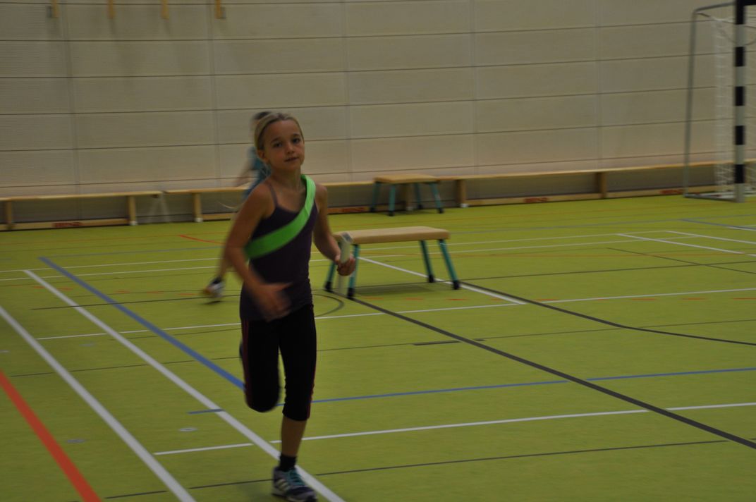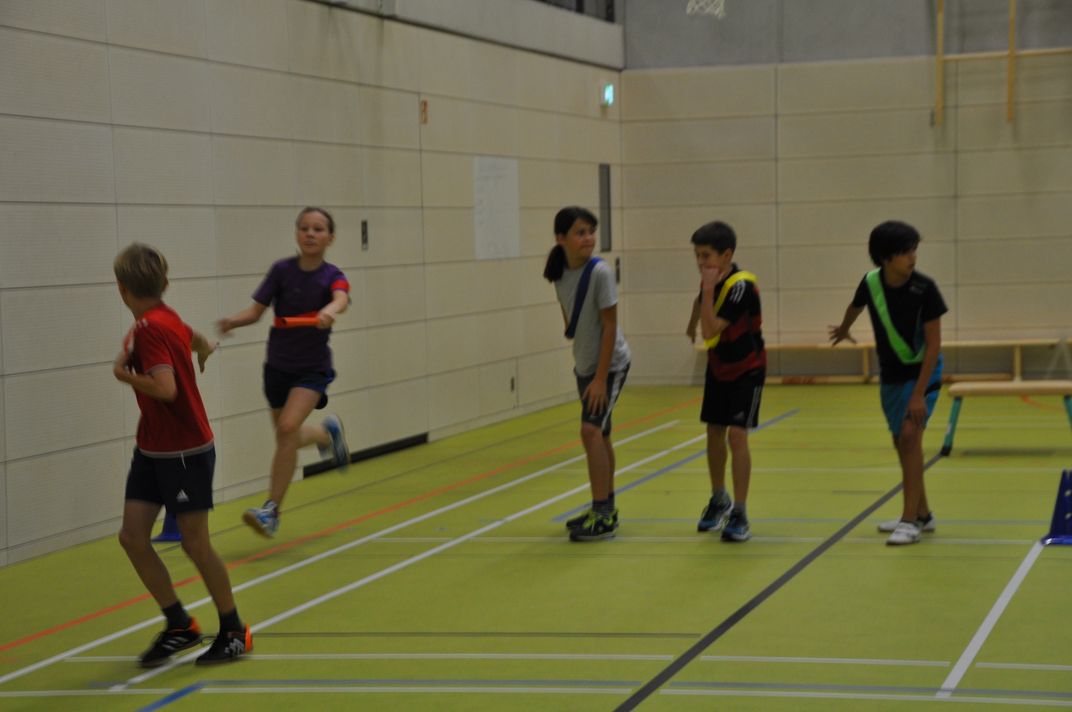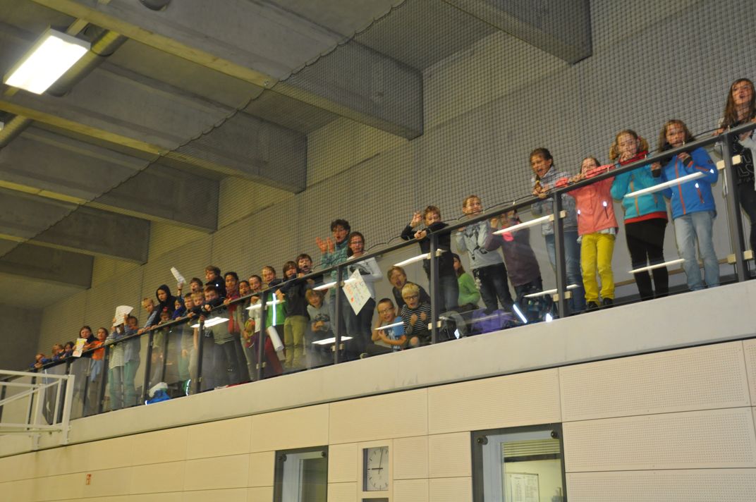 Voller Spannung und Vorfreude trafen sich die einzelnen Klassenstufen in der Turnhalle – das Publikum lautstark und mit vorbereiteten Plakaten oben, die jeweils 6 besten Läufer (3 Mädchen + 3 Jungen) aufgeregt, in Klassen aufgeteilt, in der Hallenmitte.