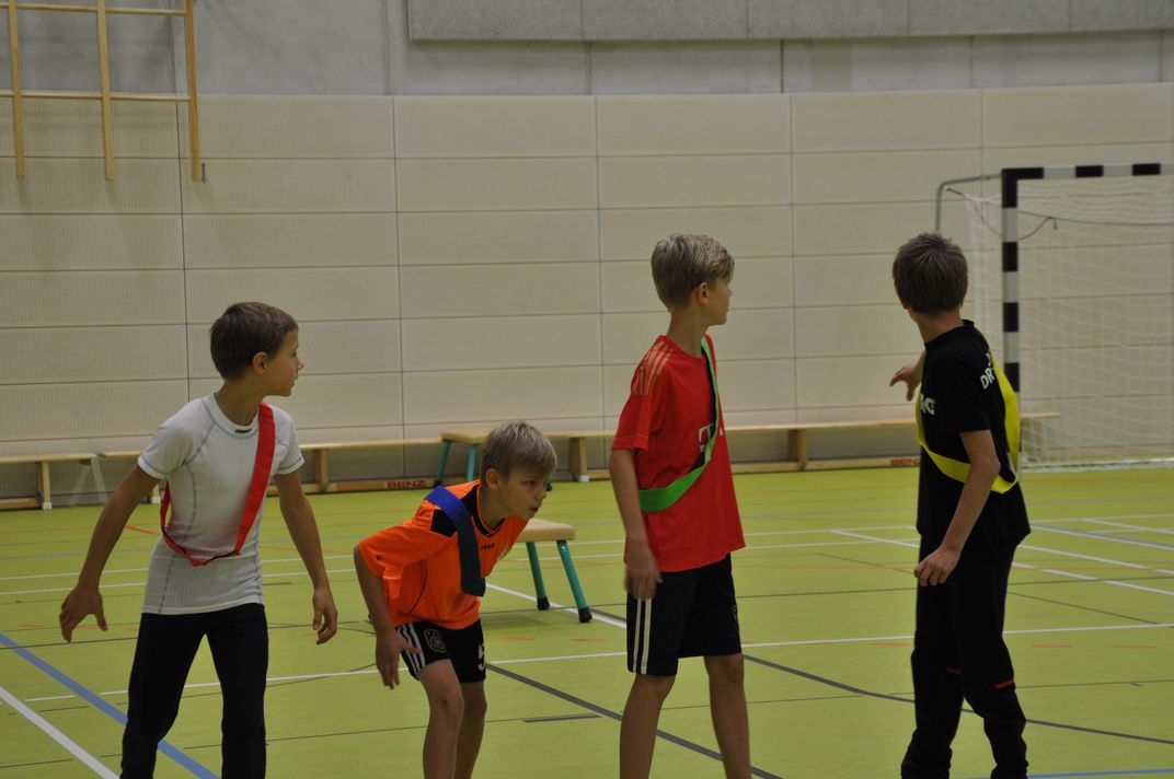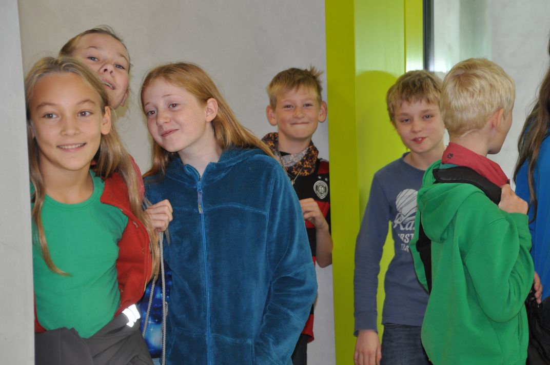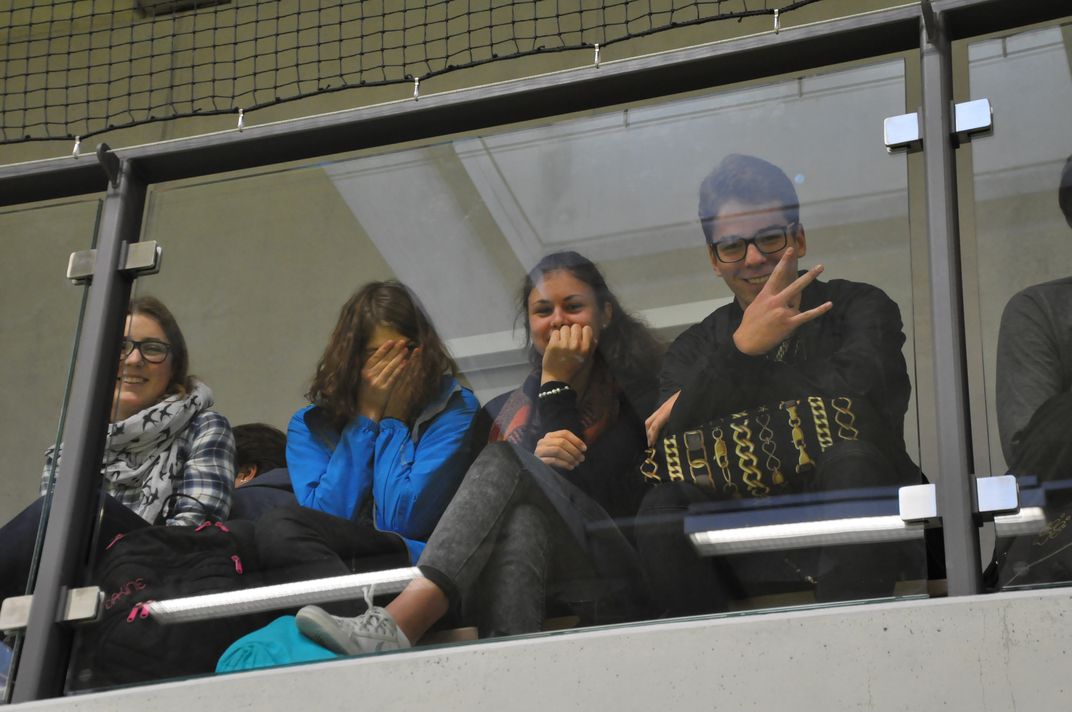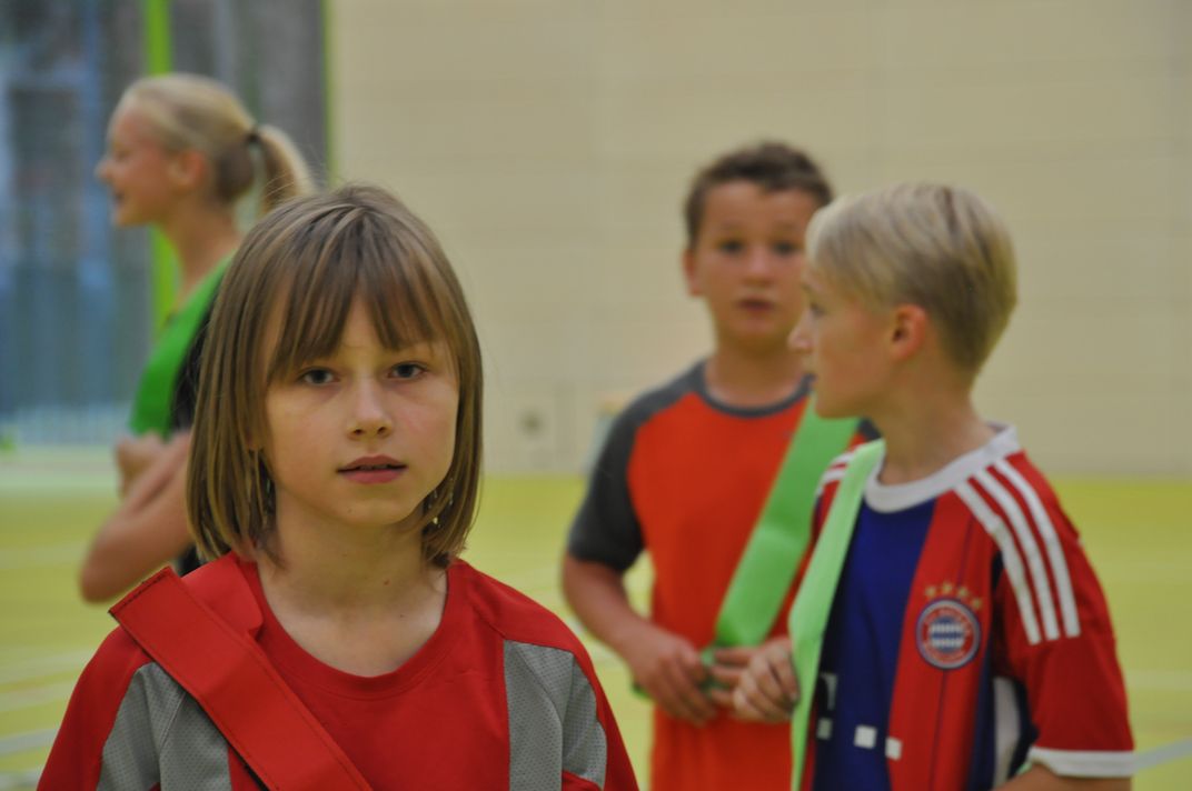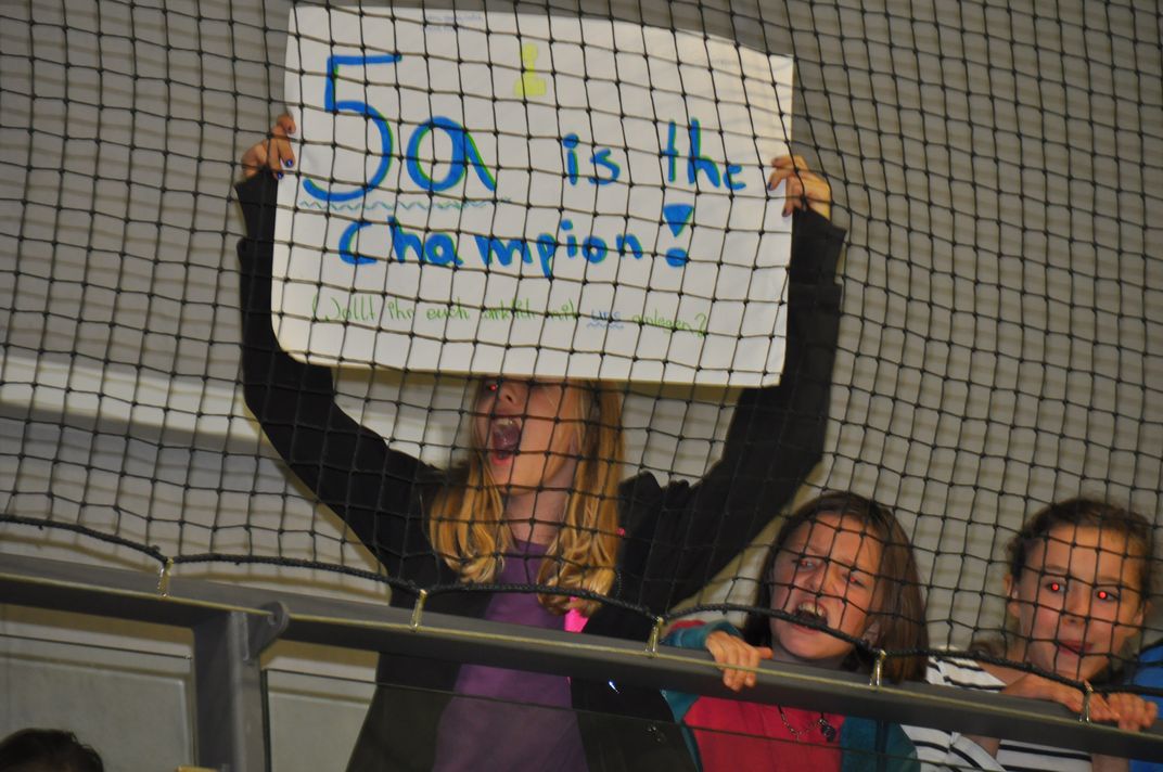 Voller Spannung und Vorfreude trafen sich die einzelnen Klassenstufen in der Turnhalle – das Publikum lautstark und mit vorbereiteten Plakaten oben, die jeweils 6 besten Läufer (3 Mädchen + 3 Jungen) aufgeregt, in Klassen aufgeteilt, in der Hallenmitte.